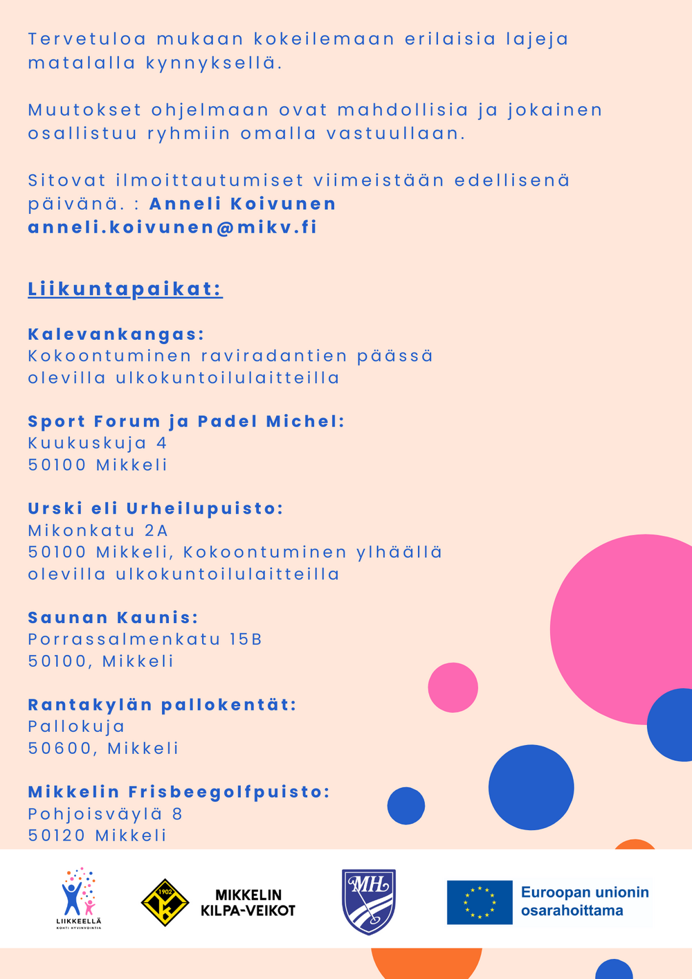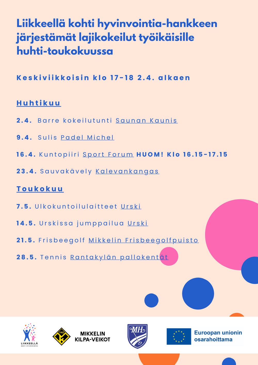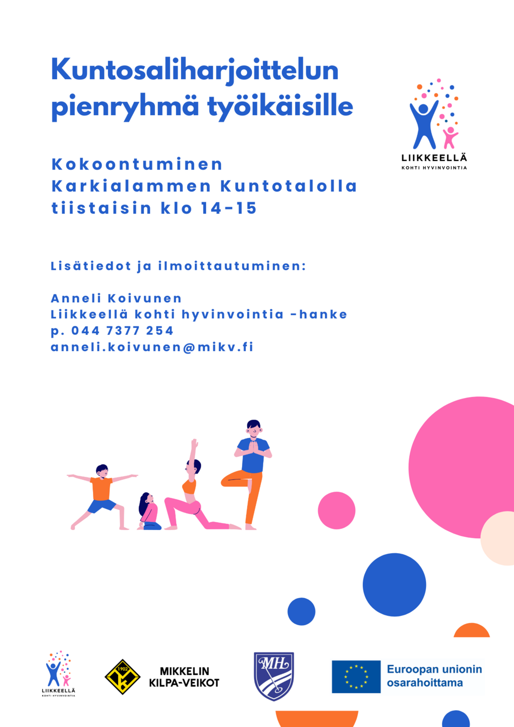 Liikkeellä kohti hyvinvointia -ryhmähankkeella haetaan ratkaisuja Mikkelin syrjäalueiden asukkaiden, perheiden sekä nuorten hyvinvoinnin tukemiseen elintapaohjausta ja vertaisohjaaja toimintamallia kehittämällä.
