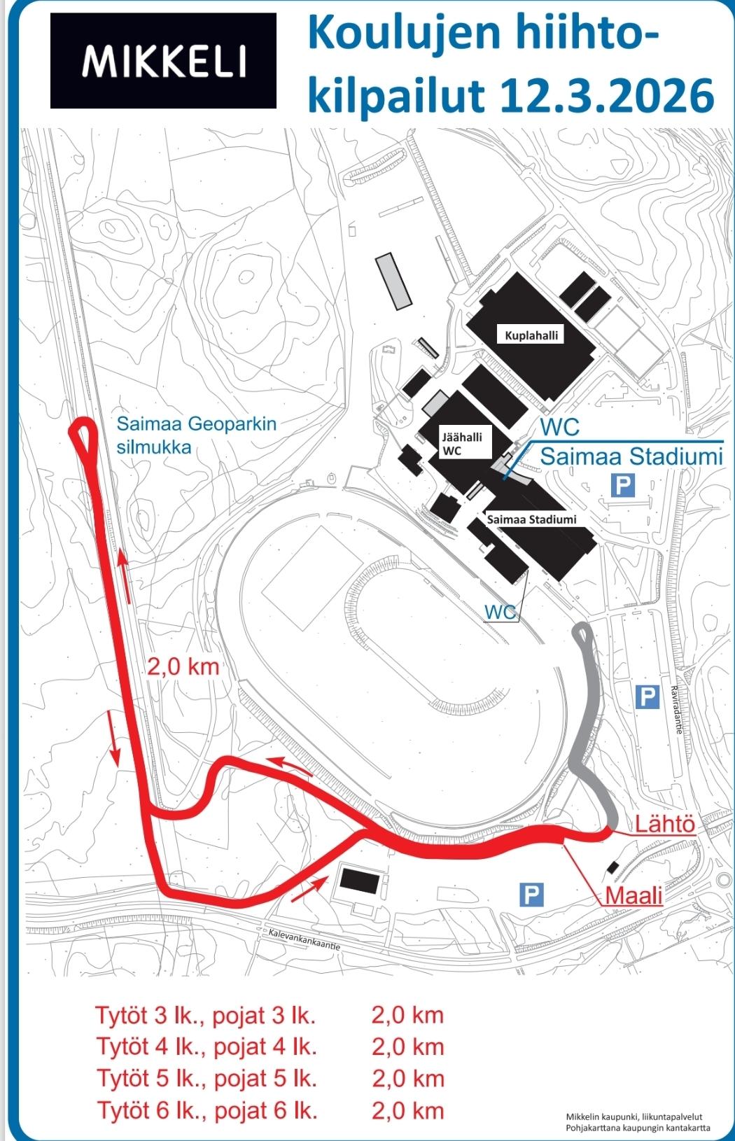 Lähtö-/maalialue: Mikkelin Hiihtäjien Voitelukopin edustalla. Voitelukoppi sijaitsee Raviradan eteläisen parkkipaikan liikenneympyrän puoleisessa päädyssä.